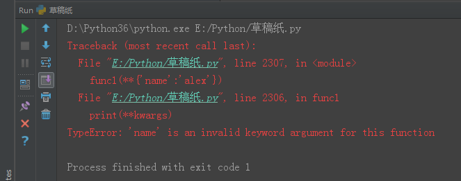def func1( **kwargs): print(**kwargs) func1(**{'name':'alex'})