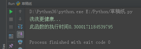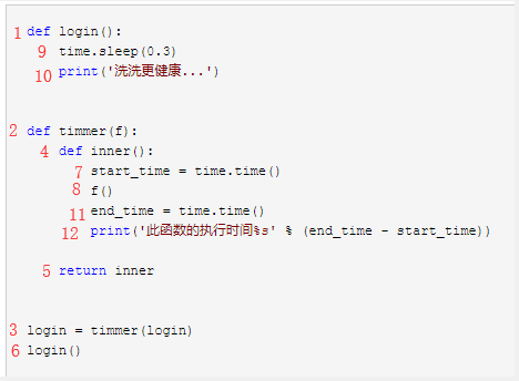 def login(): time.sleep(0.3) print('洗洗更健康...') def timmer(f): def inner(): start_time = time.time() f() end_time = time.time() print('此函数的执行时间%s' % (end_time - start_time)) return inner login = timmer(login) login()