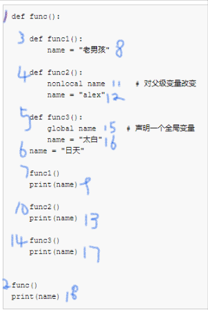 当代码从上到下加载到func()时,代码开始执行。跳到func函数体里边,加载函数func1、func2、func3,加载到func1()时执行函数func1,执行完后打印name,print(name)在函数func的作用域中,所以此时name的值为'日天';加载到fun2()时,执行函数func2,此时修改了函数func2的父作用域中的name的值为'alex',也就是函数func中name的值,打印name时,找的是func作用域中的name,此时name的值为'alex';加载到func3()时,开始执行func3,此时修改了全局变量name的值为'太白',完了打印name时,此时print(name)所在的是func的作用域,由于func2修改了func作用域中name的值为'alex',所以此时name的值依旧为'alex';现在来到了最后一行代码处,此时name找的是全局作用域中name的值,由于函数func3修改了全局作用域中name的值为'太白',所以最后输出为太白。