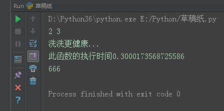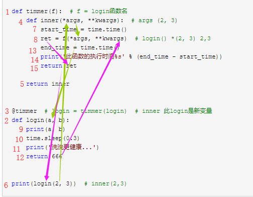 def timmer(f): # f = login函数名 def inner(*args, **kwargs): # args (2, 3) start_time = time.time() ret = f(*args, **kwargs) # login() *(2, 3) 2,3 end_time = time.time() print('此函数的执行时间%s' % (end_time - start_time)) return ret return inner @timmer # login = timmer(login) # inner 此login是新变量 def login(a, b): print(a, b) time.sleep(0.3) print('洗洗更健康...') return 666 print(login(2, 3)) # inner(2,3)