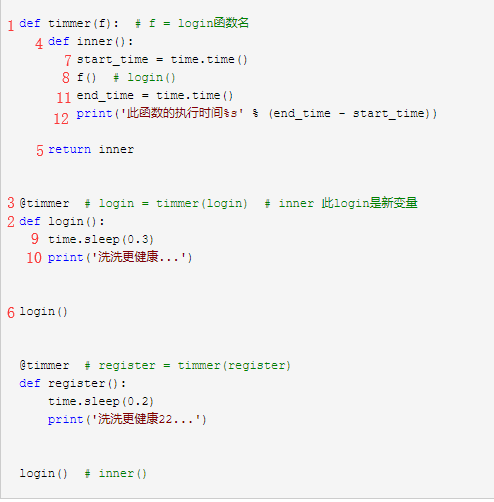 def timmer(f): # f = login函数名 def inner(): start_time = time.time() f() # login() end_time = time.time() print('此函数的执行时间%s' % (end_time - start_time)) return inner @timmer # login = timmer(login) # inner 此login是新变量 def login(): time.sleep(0.3) print('洗洗更健康...') login() @timmer # register = timmer(register) def register(): time.sleep(0.2) print('洗洗更健康22...') login() # inner()