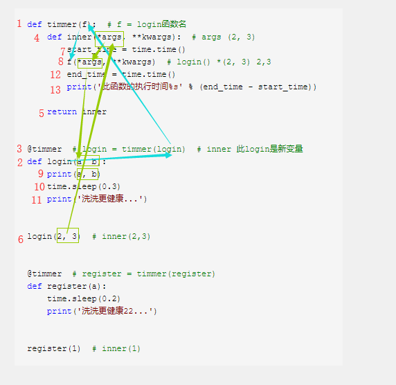 def timmer(f): # f = login函数名 def inner(*args, **kwargs): # args (2, 3) start_time = time.time() f(*args, **kwargs) # login() *(2, 3) 2,3 end_time = time.time() print('此函数的执行时间%s' % (end_time - start_time)) return inner @timmer # login = timmer(login) # inner 此login是新变量 def login(a, b): print(a, b) time.sleep(0.3) print('洗洗更健康...') login(2, 3) # inner(2,3) @timmer # register = timmer(register) def register(a): time.sleep(0.2) print('洗洗更健康22...') register(1) # inner(1)