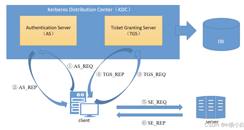 主要角色:Client客户端;Server服务端;KDC(key Distribution Center):AS(Authentication Server),TGS(Ticket Granting Server)
