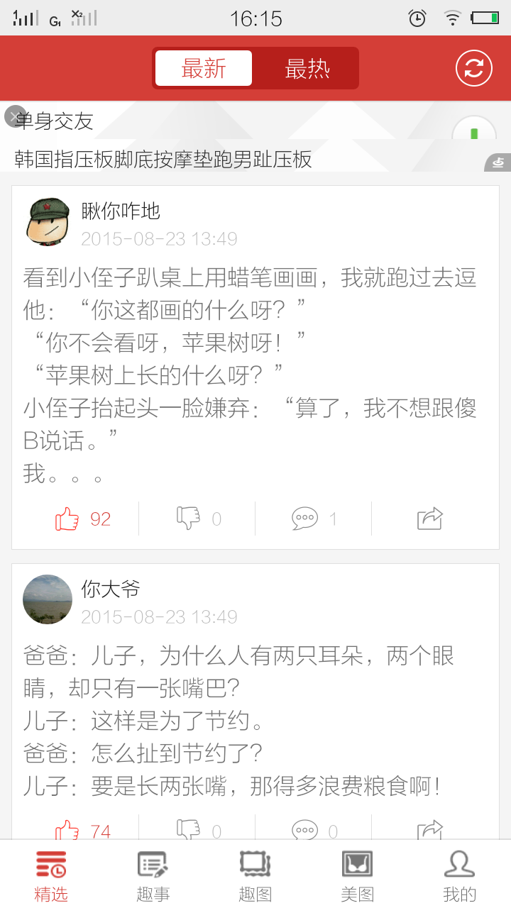 (1)最新、最热切换来查看最新发表的或者用户赞数最多的内容;
