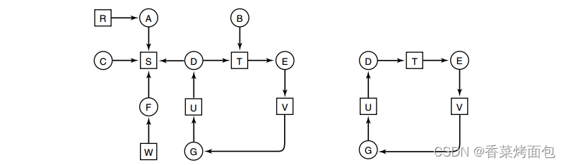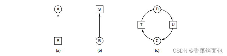 上图为资源分配图,其中方框表示资源,圆圈表示进程。资源指向进程表示该资源已经分配给该进程,进程指向资源表示进程请求获取该资源。