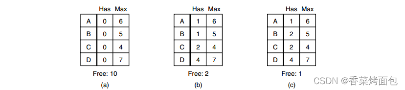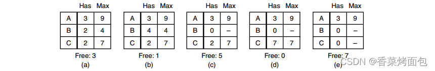 图 a 的第二列 Has 表示已拥有的资源数,第三列 Max 表示总共需要的资源数,Free 表示还有可以使用的资源数。从图 a 开始出发,先让 B 拥有所需的所有资源(图 b),运行结束后释放 B,此时 Free 变为 5(图 c);接着以同样的方式运行 C 和 A,使得所有进程都能成功运行,因此可以称图 a 所示的状态时安全的。