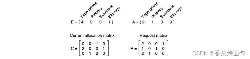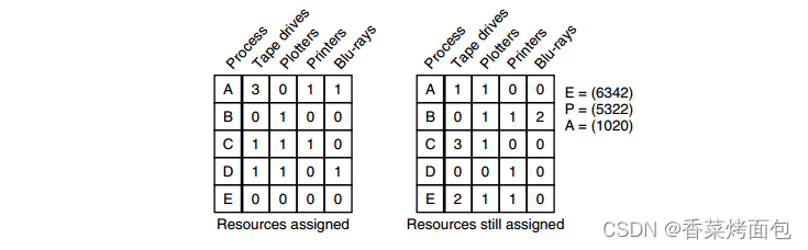 上图中有五个进程,四个资源。左边的图表示已经分配的资源,右边的图表示还需要分配的资源。最右边的 E、P 以及 A 分别表示:总资源、已分配资源以及可用资源,注意这三个为向量,而不是具体数值,例如 A=(1020),表示 4 个资源分别还剩下 1/0/2/0。
