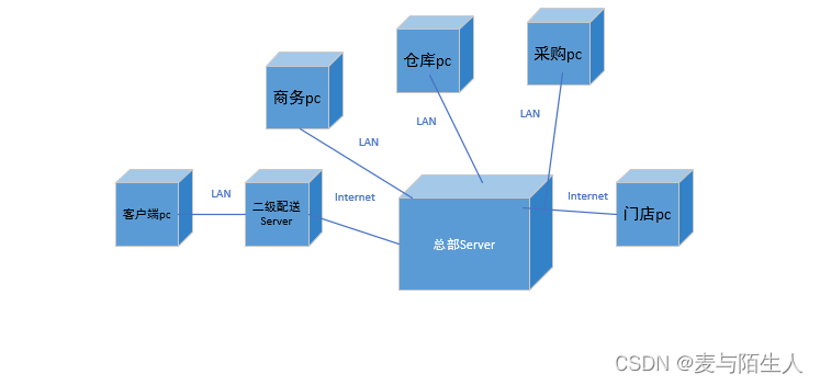 3)每个门店都有终端电脑,这些终端电脑通过互联网与总部的服务器、二级配送的服务器有联系;