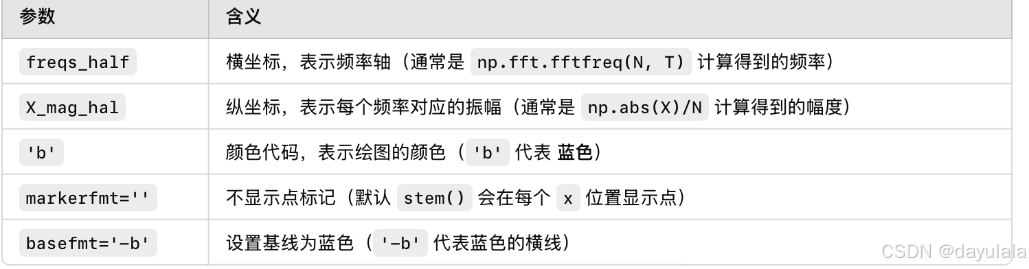 作用:绘制频谱图(幅度 vs 频率),它的作用是 使用 stem 图(茎叶图)来显示频谱数据。