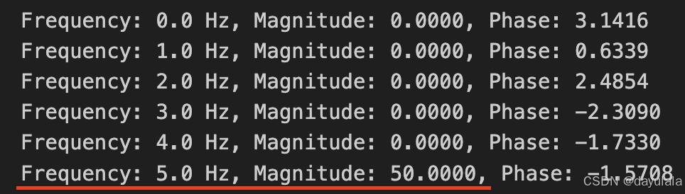 - 频域信号(右侧频谱图)只有一个非零点,位于 5 Hz,振幅为 3(与原信号匹配)。