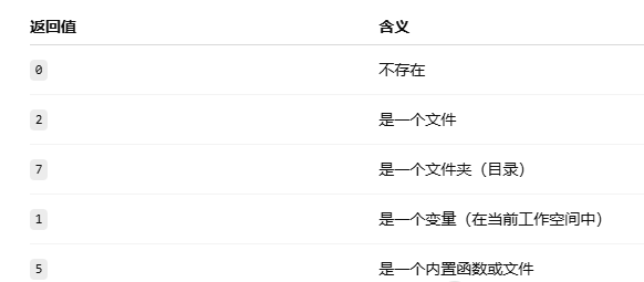 exist(...) 会返回一个 数字,用来表示“存在的类型”或“不存在”。