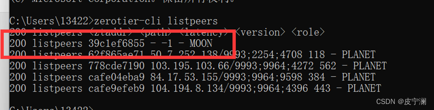 输入zerotier-cli listpeers并回车