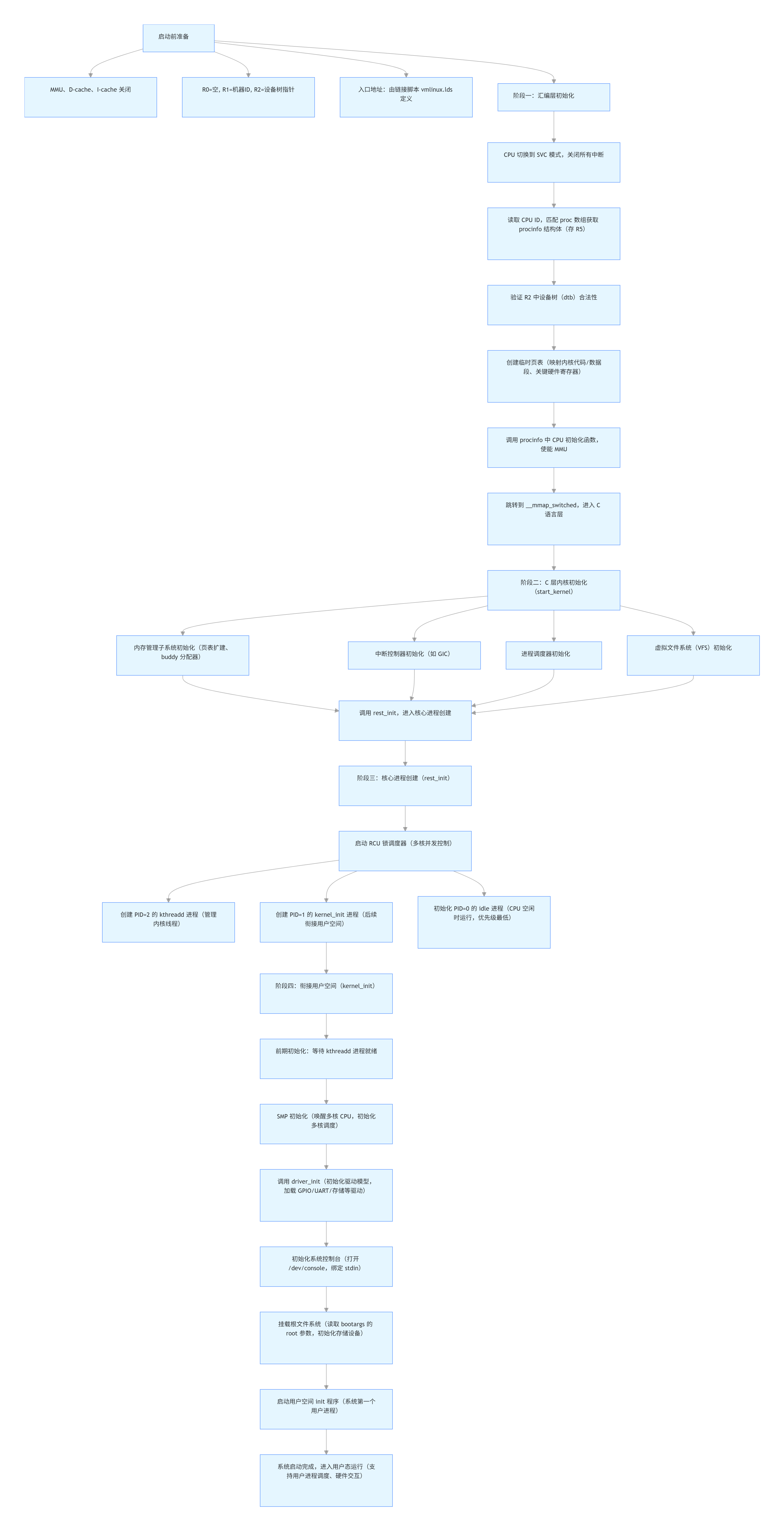 start_kernel是内核 C 层的 “总入口”,相当于内核的 “main 函数”,会调用数十个初始化函数,完成: