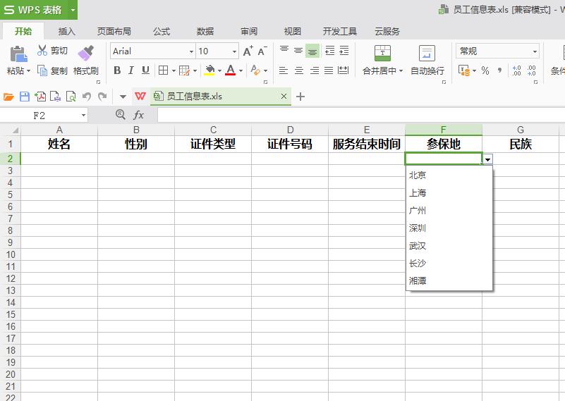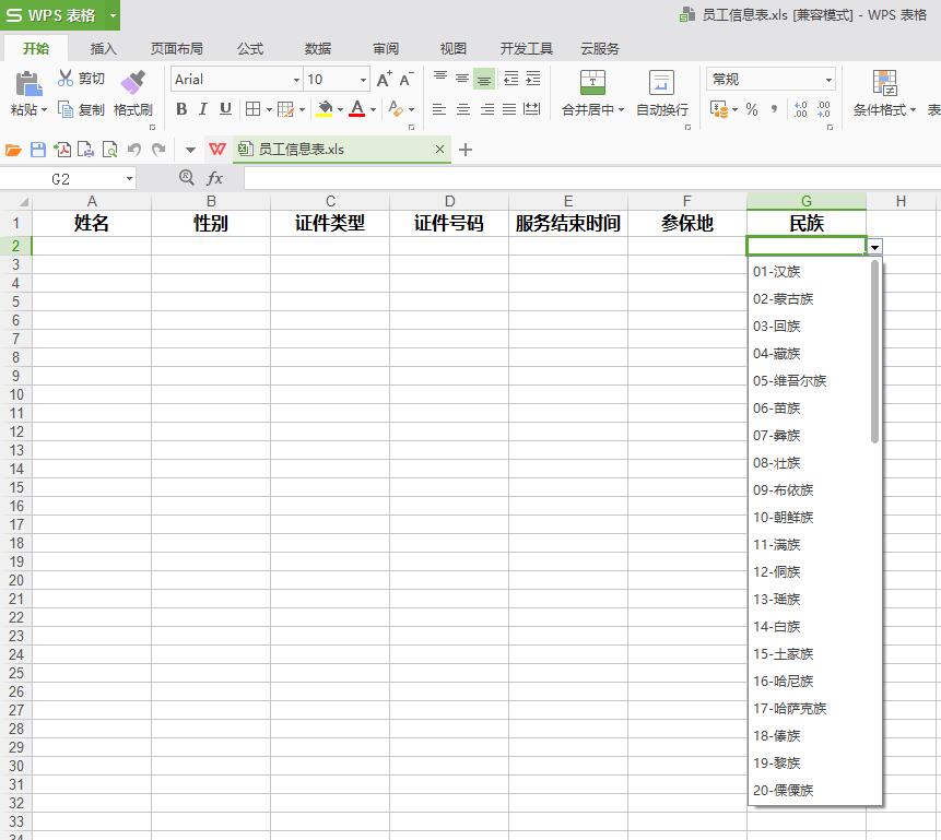 /** * @Title: getExcelTemplate * @Description: 生成Excel模板并导出 * @param @param uuid * @param @param request * @param @param response * @param @return * @return Data * @throws */ @RequestMapping("/getExcelTemplate") public void getExcelTemplate(HttpServletRequest request, HttpServletResponse response){ String fileName = "员工信息表"; //模板名称 String[] handers = {"姓名","性别","证件类型","证件号码","服务结束时间","参保地","民族"}; //列标题 //下拉框数据 List<String[]> downData = new ArrayList(); String[] str1 = {"男","女","未知"}; String[] str2 = {"北京","上海","广州","深圳","武汉","长沙","湘潭"}; String[] str3 = {"01-汉族","02-蒙古族","03-回族","04-藏族","05-维吾尔族","06-苗族","07-彝族","08-壮族","09-布依族",