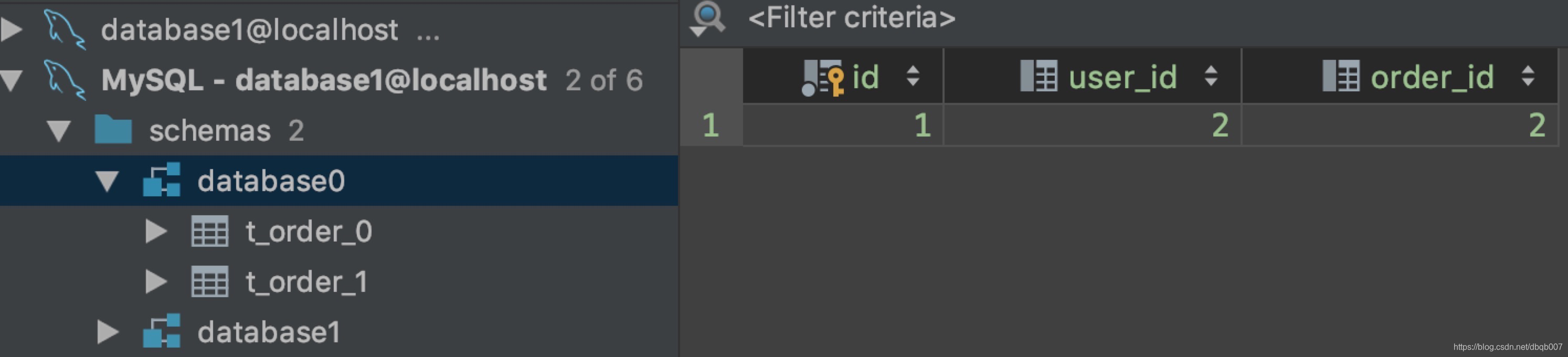 在mysql中新建两个数据库database1和database2(也可以叫别的名字),每个数据库建两张表t_order_0和t_order_1。建表语句如下: