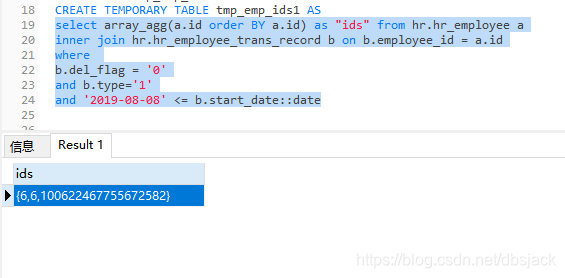 本文探讨了在SQL中创建临时表进行数据聚合的方法,并展示了如何使用数组操作来筛选特定条件下的员工记录。通过内连接和类型筛选,实现了对有效期内员工ID的高效查询。