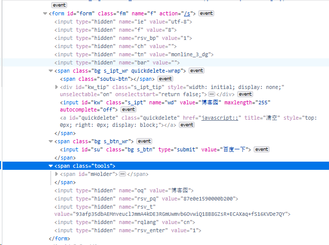 对应连接为 https://www.baidu.com/baidu?tn=monline_3_dg&ie=utf-8&wd=%E5%8D%9A%E5%AE%A2%E5%9B%AD。该form的默认method为GET方式。