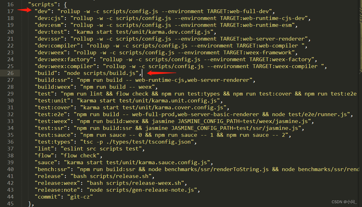 在上一篇的 index.html 中我们引用了 /vue/dist/vue.js 来构建一个应用,这个 vue.js 是 Vue 使用 rollup 来打包生成的,在源码目录中可以根据 package.json 文件的 scripts 字段查看 Vue 的构建命令。