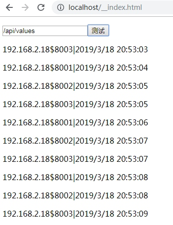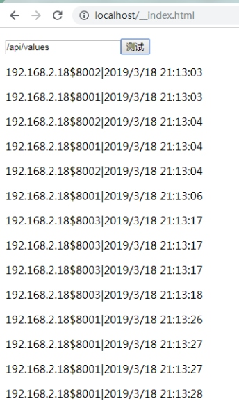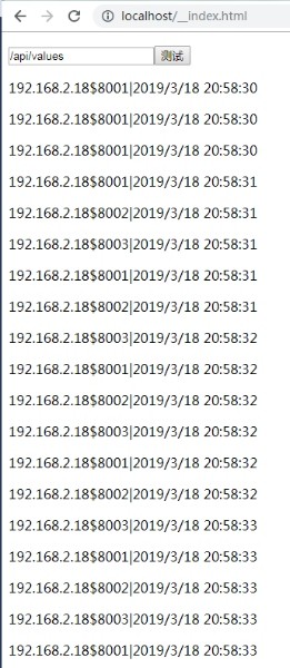 为了方便测试示例网关集成了一个测试页面,通过页面请求网关可以看到响应情况;由于配置是三台服务平均负载请求,所以测试请求的情况会看到具体请求会被平均化到不同服务上。