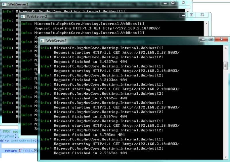接下需要编写三个Asp.net core web api项目,分别部署配置到以上三个配置的地址中;为了方便测试服务,对应的方法是返回相应的服务地址IP端口
