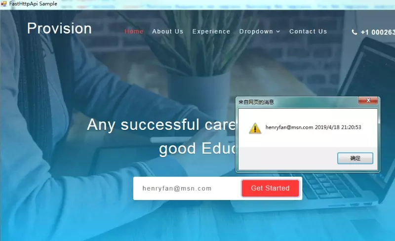 [Controller] public class WebAction { public object GetStarted(string email) { return new TextResult($"{email} {DateTime.Now}"); } }