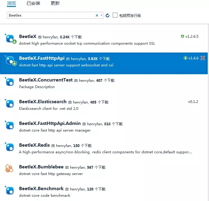 组件在1.4.5.8版本后加入了对netstandard2.0的支持,只需要在Nuget上添加这个或更高版的BeetleX.FastHttpApi即可
