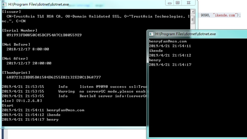 class Program : BeetleX.ServerHandlerBase { private static BeetleX.IServer mServer; static void Main(string[] args) { mServer = SocketFactory.CreateTcpServer<Program>(); mServer.Options.DefaultListen.SSL = true; mServer.Options.DefaultListen.CertificateFile = "c:\\ikende.com.pfx"; mServer.Options.DefaultListen.CertificatePassword = "******"; mServer.Open(); Console.WriteLine(mServer.Status); Console.Read(); } protected override void OnLogToConsole(IServer server, ServerLogEventArgs e) { Console.WriteLine($"{DateTime.Now}\t{e.Type}\t{e.Session?.RemoteEndPoint} {e.Message}"); } public override void SessionReceive(IServer server, SessionReceiveEventArgs e) { base.SessionReceive(server, e); var stream = e.Stream.ToPipeStream(); if (stream.TryReadLine(out string line)) { Console.WriteLine(line); stream.WriteLine($"{DateTime.Now}"); e.Stream.Flush(); } } }