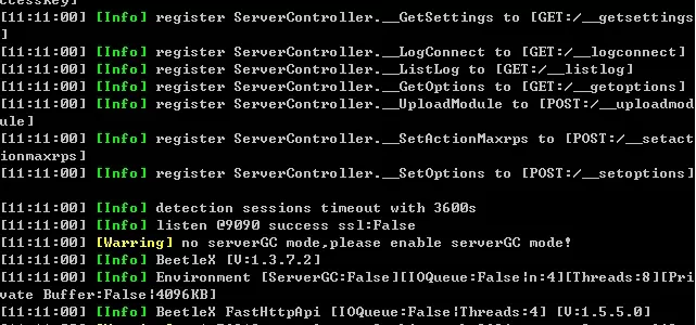 以上代码是加载本项的程序集,并启动一个测试管理界面.默认开启的服务端口是9090,可以在Start方法指定服务的端口.启动日志如下:
