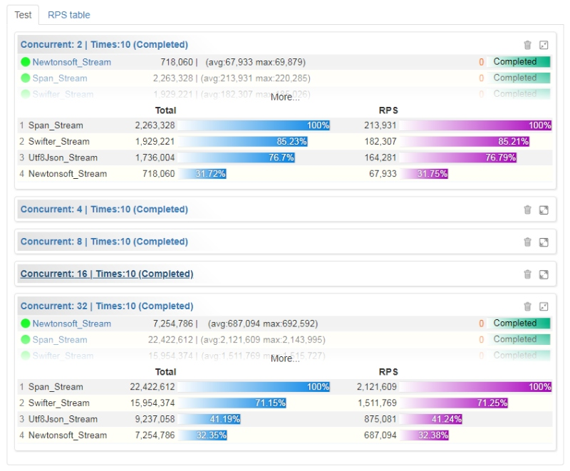 组件也支持多用例压测对比,只需要在测试的时候选择多个测试用例即可。接下来简单地测试一下不同json组件序列化的性能对比。 测试分别有Newtonsoft.Json,Utf8Json,SwifterJson和spanJson.相应代码如下: