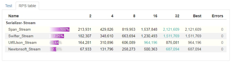 [System.ComponentModel.Category("Serializer-Stream")] class Swifter_Stream : CodeBenchmark.IExample { public void Dispose() { } public async Task Execute() { MemoryStream.Position = 0; var users = User.List(10); await Swifter.Json.JsonFormatter.SerializeObjectAsync<List<User>>(users, TextWriter); TextWriter.Flush(); } private System.IO.MemoryStream MemoryStream = new System.IO.MemoryStream(); private System.IO.TextWriter TextWriter; public void Initialize(Benchmark benchmark) { TextWriter = new System.IO.StreamWriter(MemoryStream, Encoding.UTF8); } }