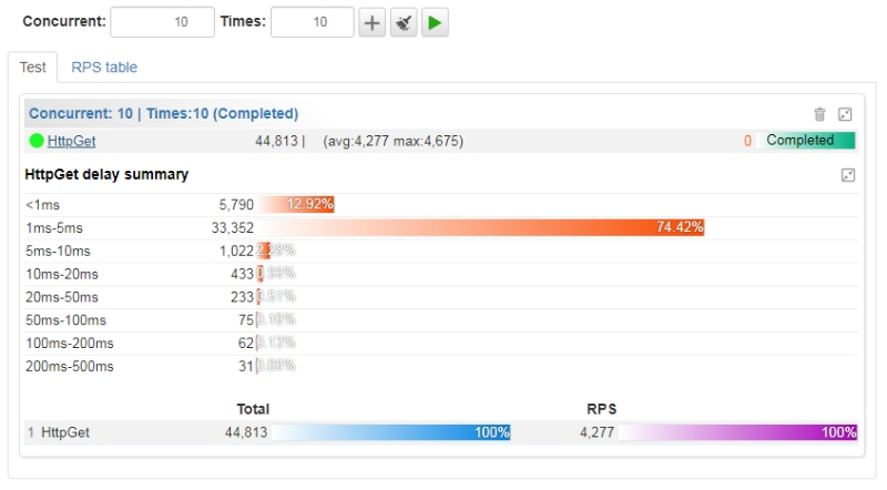 运行后能看到并发完成的数量和平均的RPS,点击测试的用例还能看到延时分布,可以知道大部分处理分布在那个时间区域。