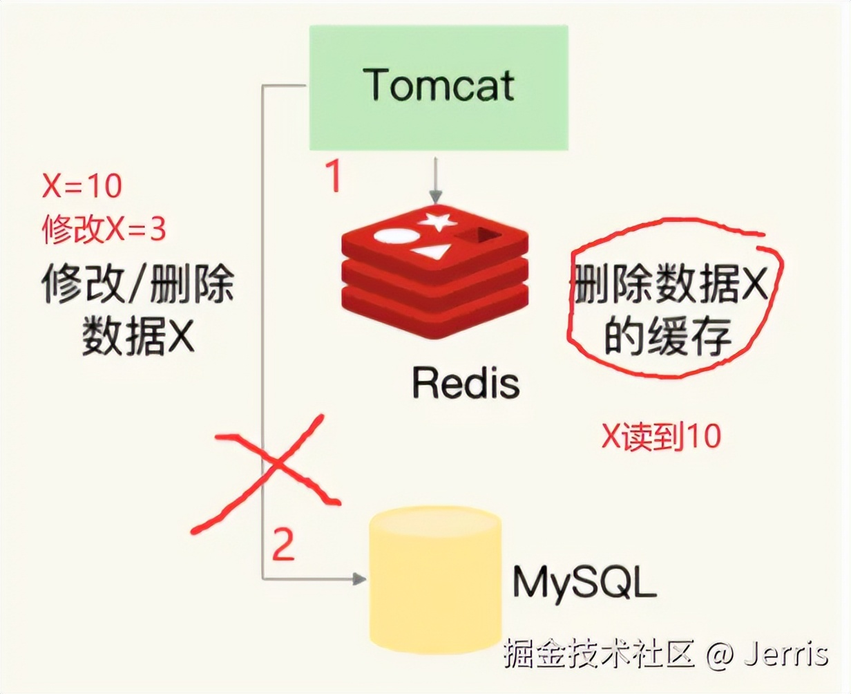 - 请求 A 会先删除 Redis 中的数据,然后去数据库进行更新操作。