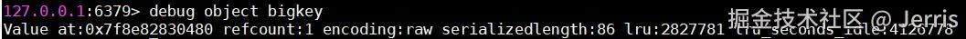 判断一个 key 是否为 Big Key,只需要执行 debug object key 查看 serializedlength 属性即可,它表示 key 对应的 value 序列化之后的字节数。