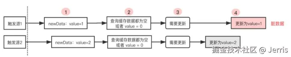 若一条 DB 数据出现了多次更新,且刚好被不同的触发源触发,更新缓存时候若未加控制,可能出现数据更新错乱,如下图所示: