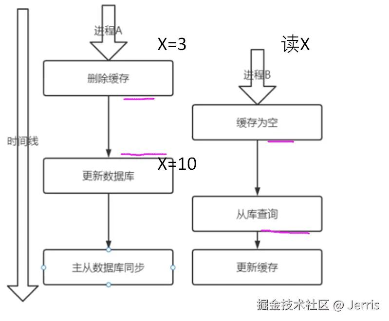 此时来了两个请求,请求 A(更新操作)和请求 B(查询操作)。请求 A 更新操作,删除了 Redis 缓存,请求主库进行更新操作,主库与从库进行同步数据的操作,请求 B 查询操作,发现 Redis 中没有数据,去从库中获取数据,此时同步数据还未完成,拿到的数据是旧数据。