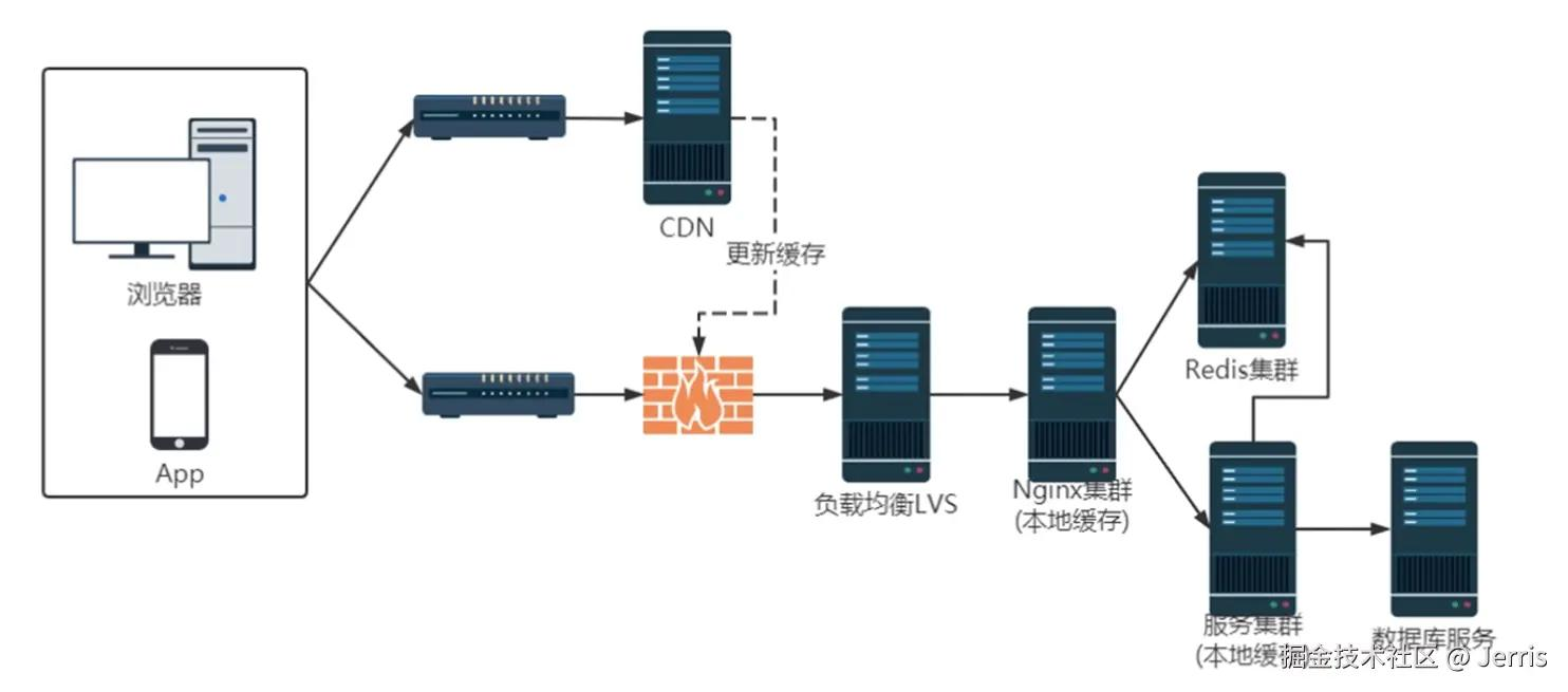 一个使用了 Redis 集群和其他多种缓存技术的应用系统架构如图: