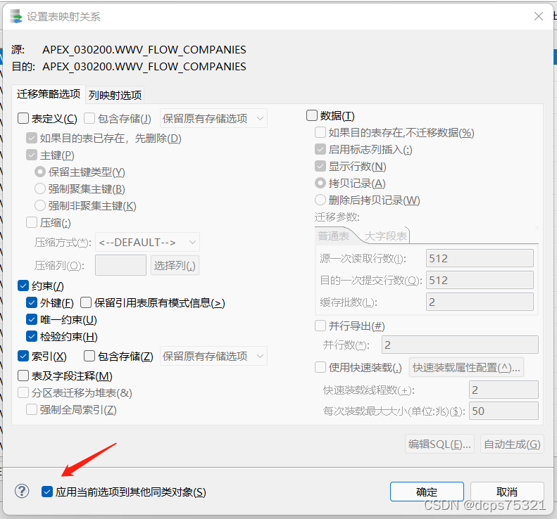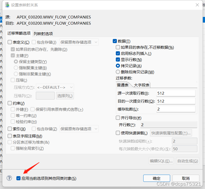 点击“选择”,并点击“转换”,勾选“数据”,启用标志列插入、显示行数、拷贝记录。如果之前迁移过数据,那还可以勾选“删除后拷贝记录”。还可以看情况勾选并行导出,其他不勾选。记得勾选,应用当前选项到其他同类对象,并“选择”全部