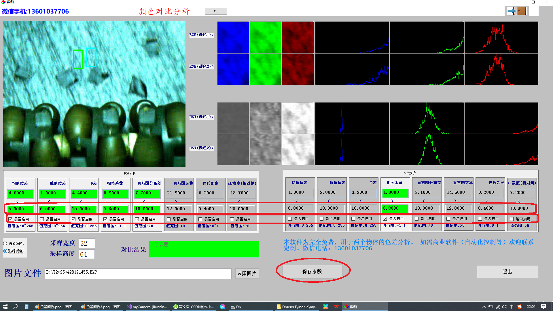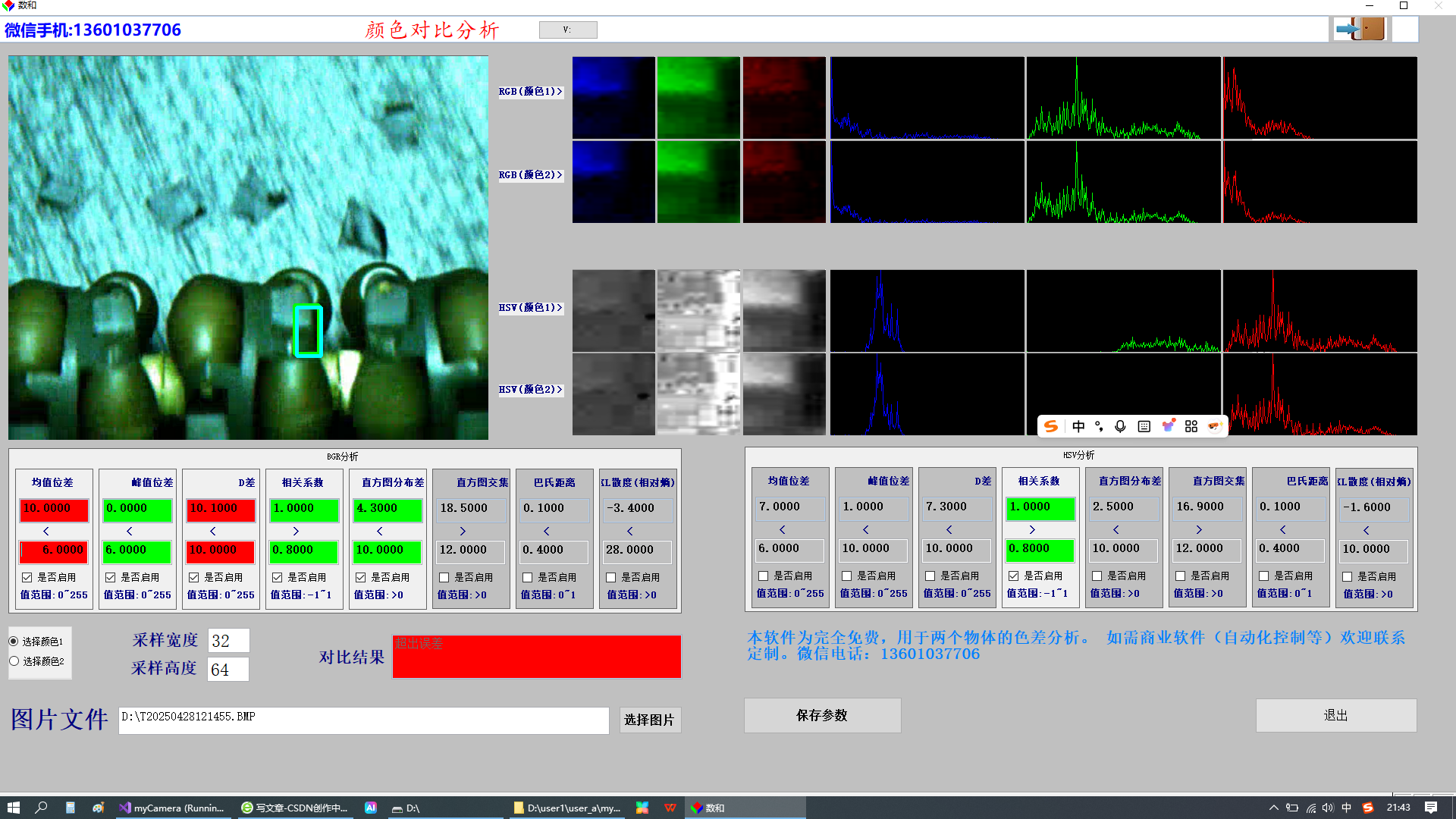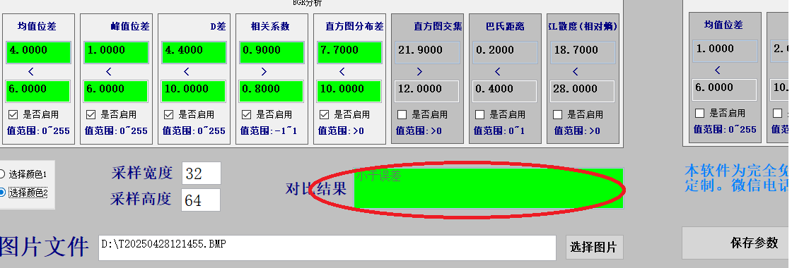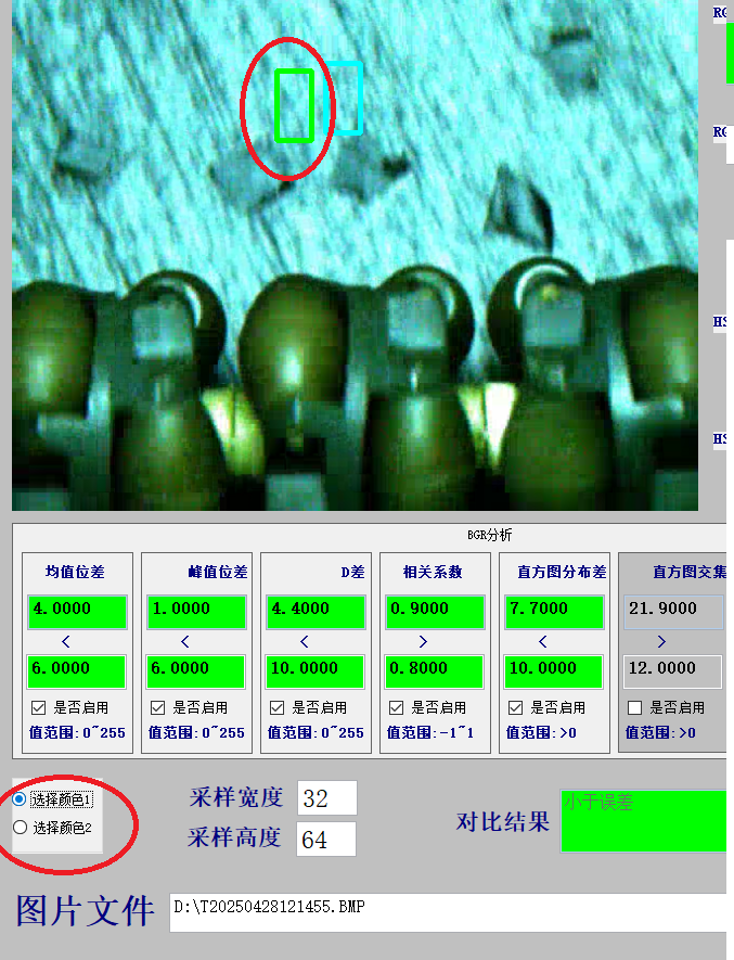 质值(包括:均值,峰值,相关系数,直方图分布差,直方图交集,巴氏距离,相对熵等)进行分析比较,并设置误差,来判断两种颜色在色差范围内,是否一直。