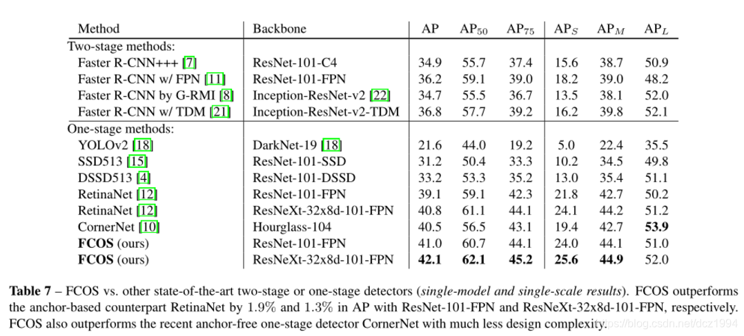 1. 具有较大stride的深层特征图结果有一个比较低的recall. 对于基于anchor的detectors. 可以降低判定为正anchor box需要的IoU分数来提高recall. 但是FCOS并不存在由于步幅较大而最终特征图上没有位置的对象的召回率低的问题.