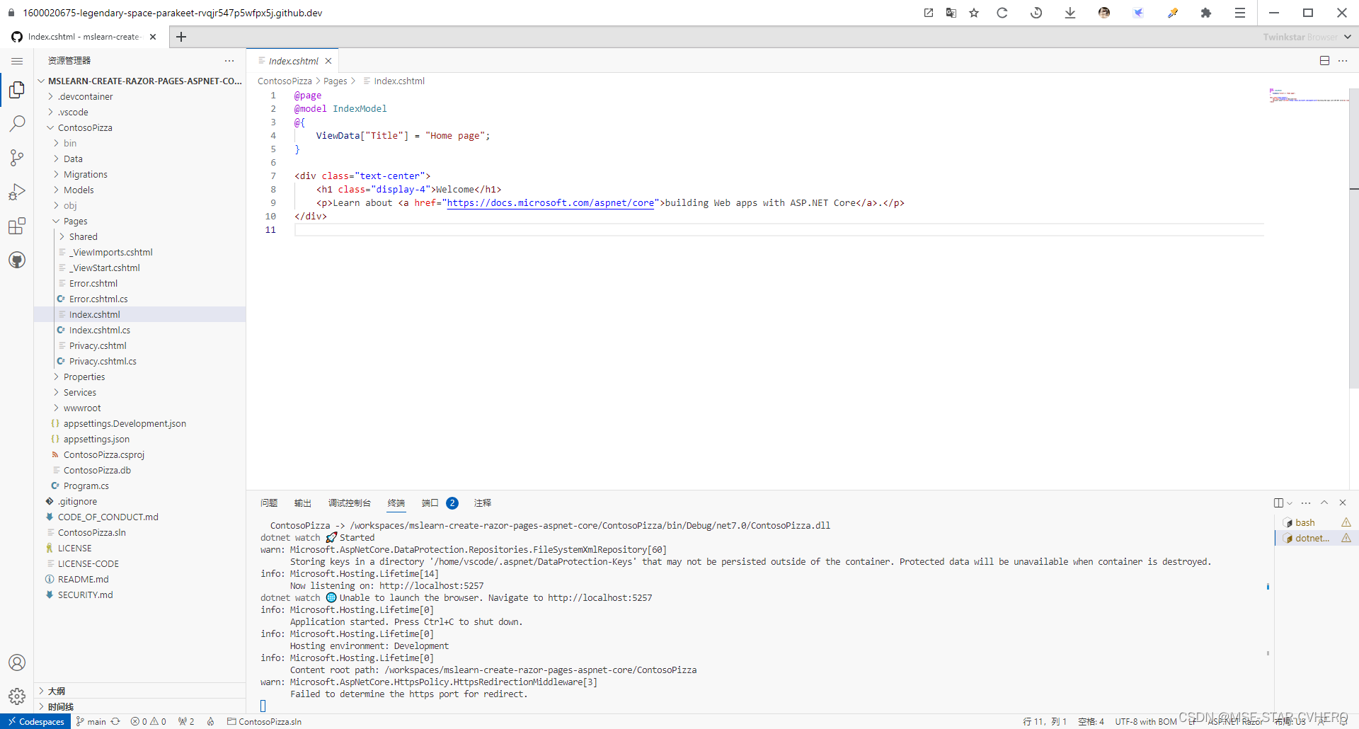 让我们花一些时间来熟悉 ContosoPizza 文件夹中的现有代码。 该项目是使用 dotnet new webapp 命令创建的 ASP.NET Core Web 应用。 下面描述了你的团队成员所做的更改。