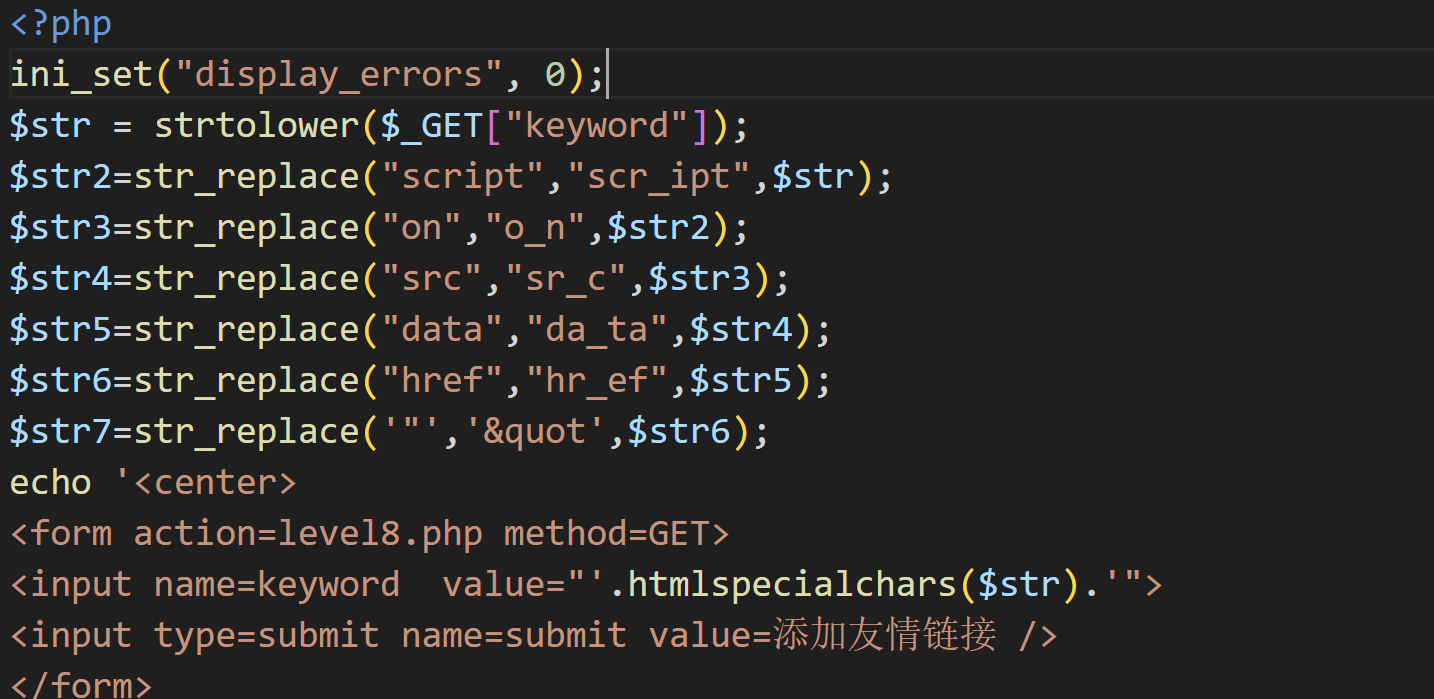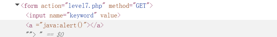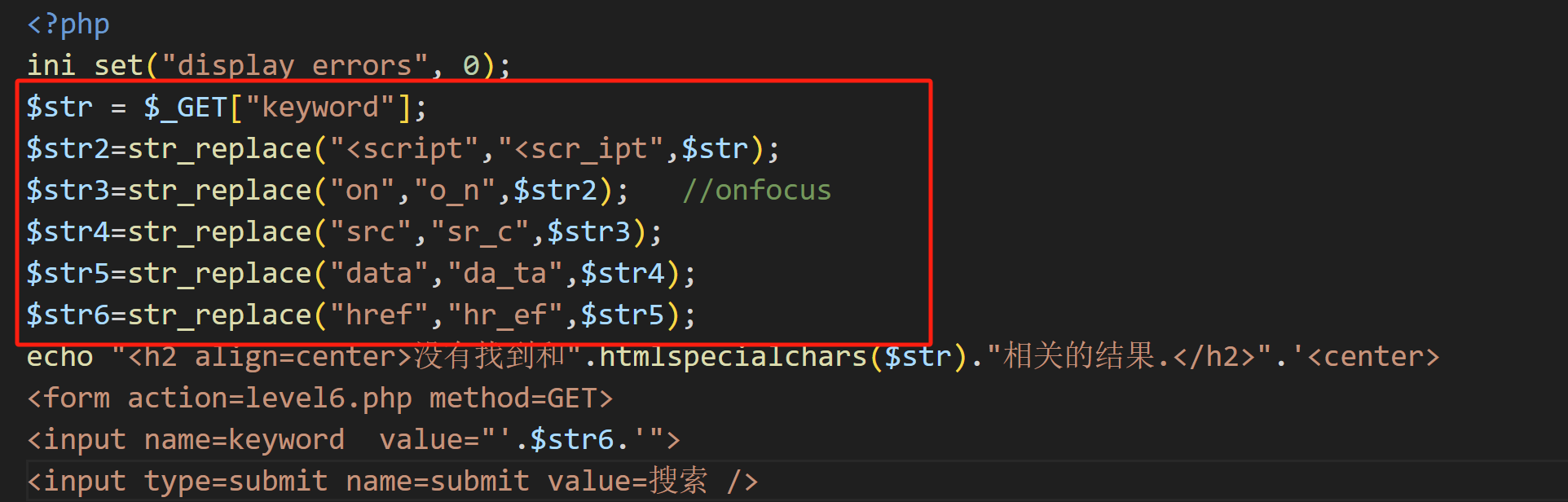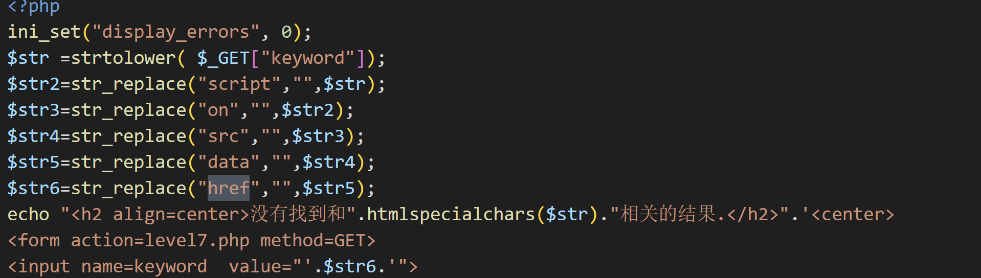 其实也要着急看源码,简单输入'aaaa'并在网页中按下 F12 键打开浏览器开发者工具观察一下,试一试几个常用的xss注入方式。这一关过滤了js的标签还有onfocus事件,虽然str_replace不区分大小写,但是有小写字母转化函数,所以就不能用大小写法来绕过过滤了,只能新找一个方法进行xss注入,这里我们用a href标签法。