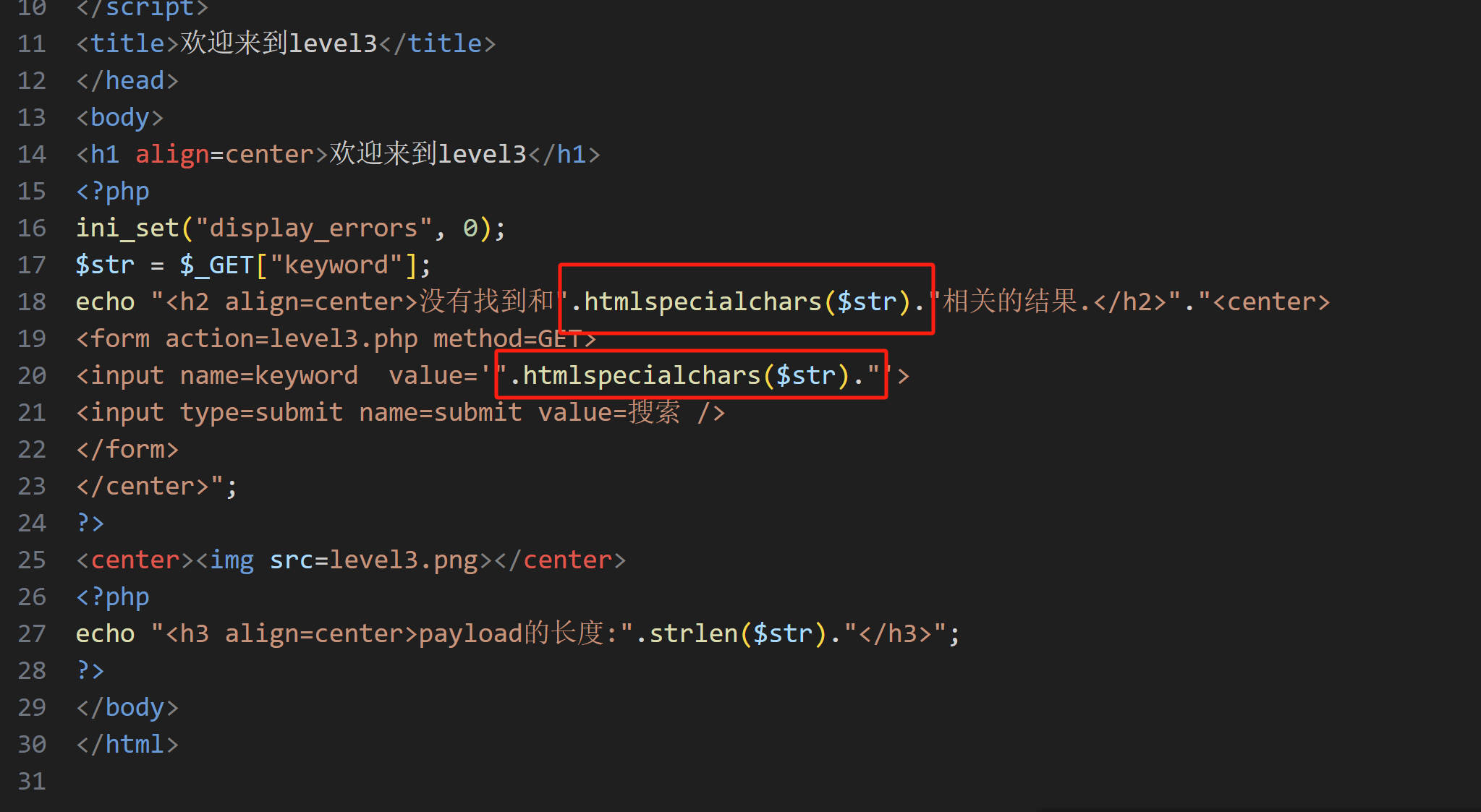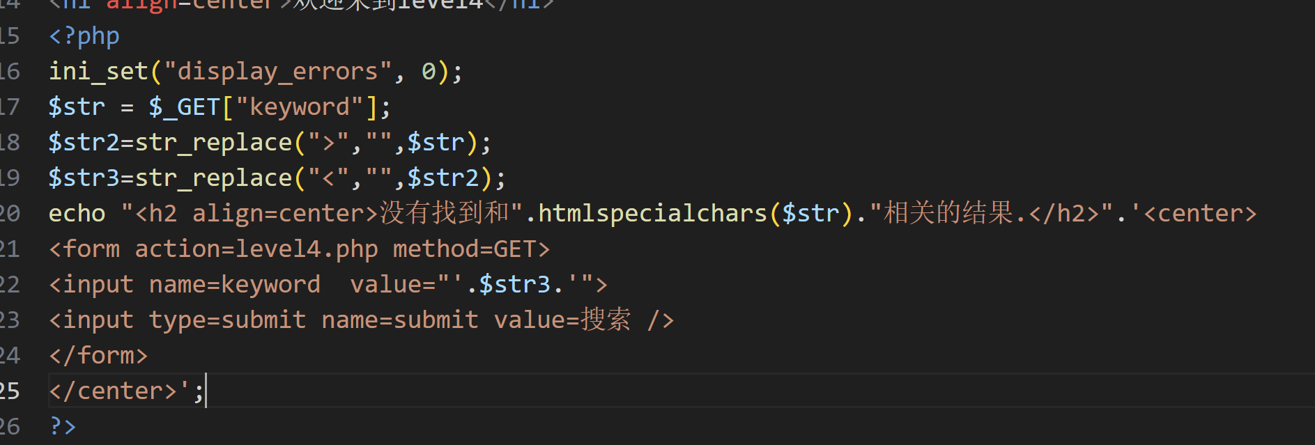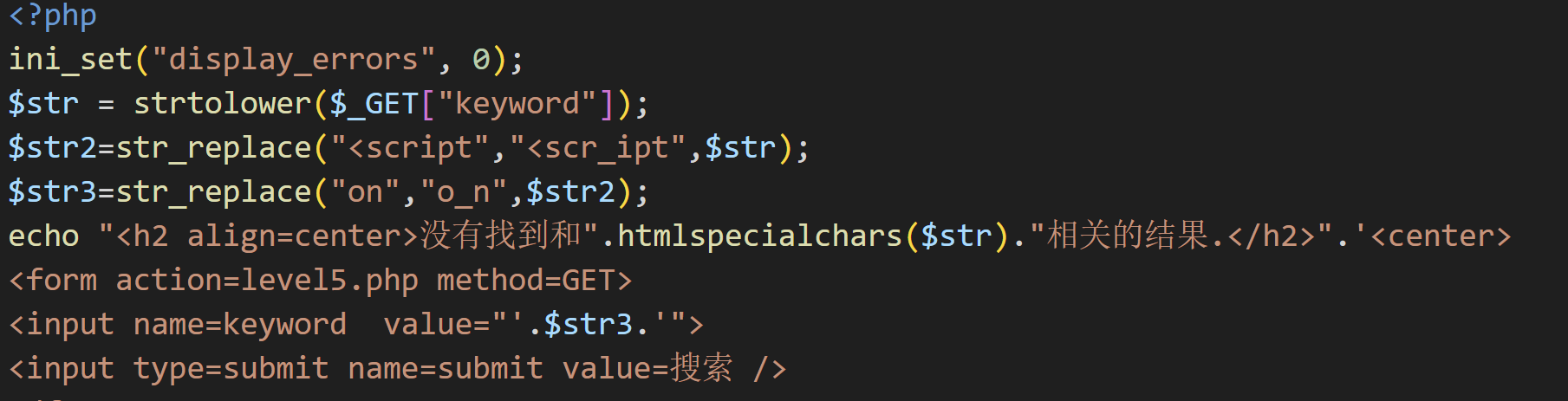 其实也要着急看源码,简单输入'aaaa'并在网页中按下 F12 键打开浏览器开发者工具观察一下,试一试几个常用的xss注入方式。这一关过滤了js的标签还有onfocus事件,虽然str_replace不区分大小写,但是有小写字母转化函数,所以就不能用大小写法来绕过过滤了,只能新找一个方法进行xss注入,这里我们用a href标签法。