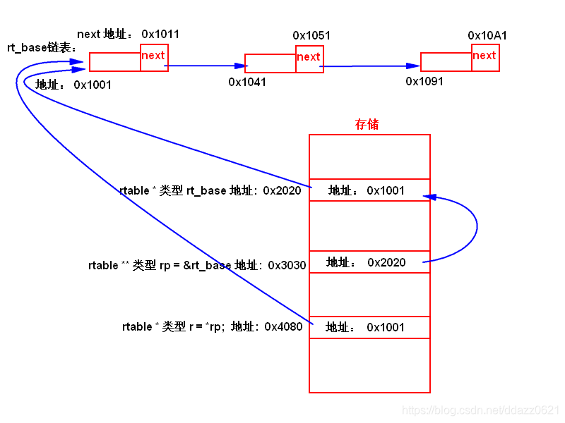 上图画出了代码中涉及三个变量:struct rtable *rt_base;struct rtable *r, **rp 的结构在起初第一次刚进while循环时的指针所指位置(图中所有的地址都是自己假设的;假设链表节点内容长度为0x10,可以算出第一个节点的next指针的地址为:0x1011)。