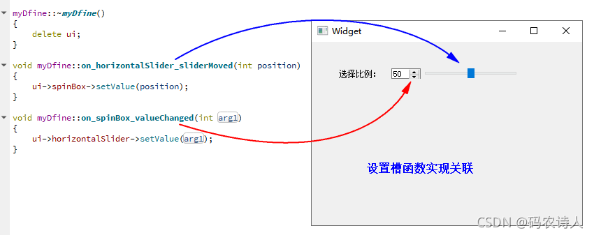 5、设定自定义控件中的两个子控件槽函数,实现控件相互的关联,如下图: