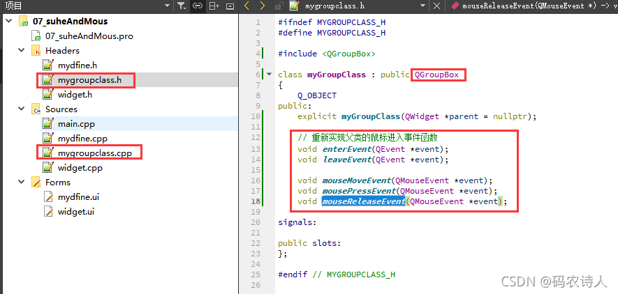 本文介绍了如何在Qt环境中创建自定义控件并集成到主界面,通过步骤展示了如何设计组合套件,以及如何定义鼠标事件来改变鼠标形状和响应鼠标操作。在自定义类中,覆盖enterEvent、leaveEvent、mouseMoveEvent和mousePressEvent等函数,实现在GroupBox控件上的鼠标行为定制。