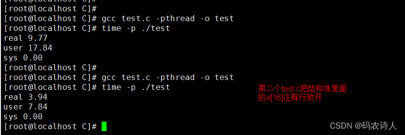 两个线程分别操作全局变量中的结构体变量数据,由于缓存行的大小为64字节,所以第一种情况两个线程都会把结构体变量中的x, y缓存到自己的缓存行中,这样每次做计算时都需要线程同步,因此运行时长比较长。第二种情况x, y变量中间有int a[16]变量,超过64字节,因此两个线程的缓存行只存了自己所需的x或y,不涉及线程同步,因此用时较短。