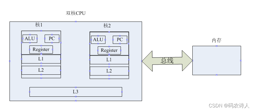 对于多线程进程来说 ,在有多个CPU或单个CPU多核的机器上执行时,肯定会保证数据多线程执行时的数据同步。如下图为单CPU双核结构。