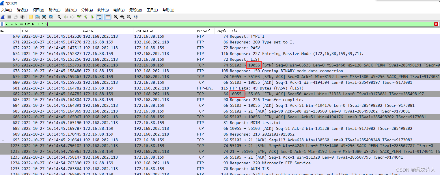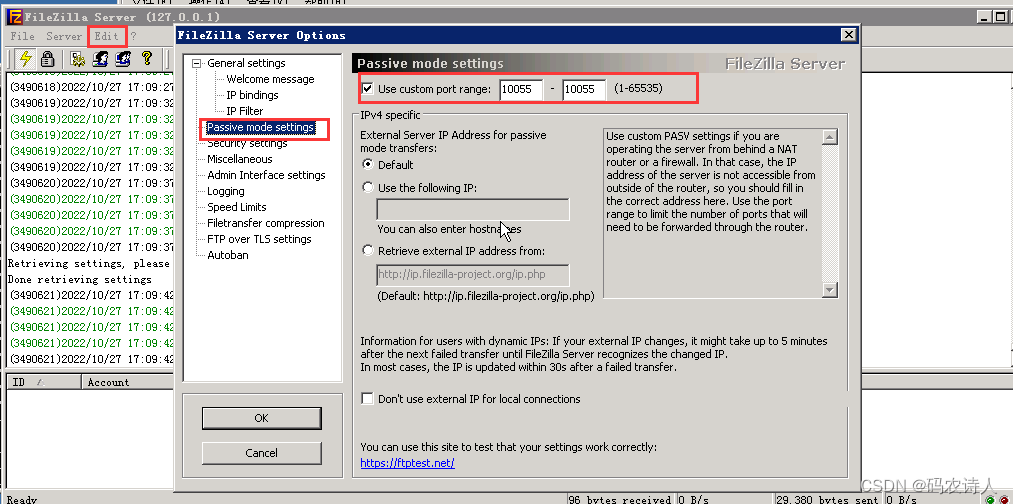 Passive 也存在一个问题:ftp服务器除了命令通道(21端口的服务连接)外,还需要一个数据通道,该数据通道的目的端口(ftp服务器端)如果不加以限制,理论上ftp服务端则会随机开放一个 1025 ~ 65535 之间的端口。这样在出口防火墙配置策略方面会存在严重问题。最好的方法就是将ftp服务端开放的端口限定在一个很小的区域内,如:50055-50055,这种配置会使得服务端会开放一个特定的50055端口来用于数据通道传输,极大程度的提高了系统的网络安全。幸运的是无论是windows server 自带的 ftp 服务器 还是 filezilla server软件都可以配置被动模式的端口范围。