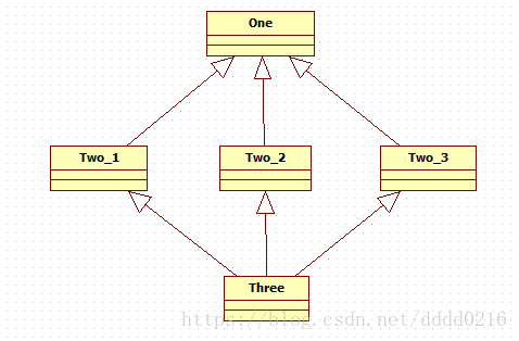 菱形问题:三个派生类同时继承一个基类,又存在另一个派生类同时继承这三个派生类。这将导致创建三个基类对象(calss One),当我们通过Three去调用One的函数实现时, 将出现错误,编译器不知道调用哪个One的函数,这将是我们不愿意发生的。