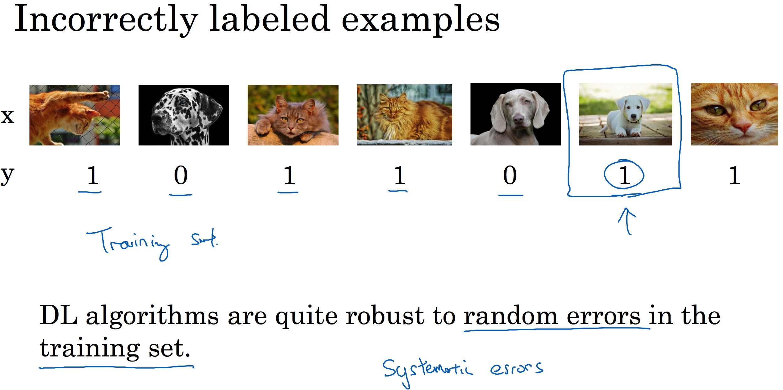 训练集上的标注错误:深度学习算法在应对训练集中随机的误差相当鲁棒。如果标签错误的数据离随机误差不远并且训练集足够大,对算法的影响也不会很大,不需要花费过多的时间去修正错误的标签。深度学习算法对系统性误差并没有那么鲁棒,需要加以注意。对误差的性质进行分类也会影像算法的调整策略。